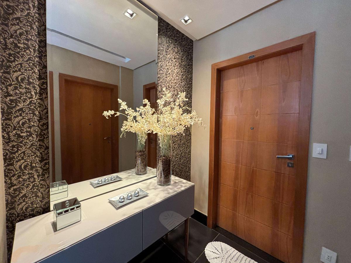 5 quartos com armários planejados, sendo três suítes, incluindo uma suíte máster com hidromassagem e iluminação personalizada. Os banheiros possuem bancadas em mármore, armários, box e espelhos. Um dos quartos foi transformado em um escritório.