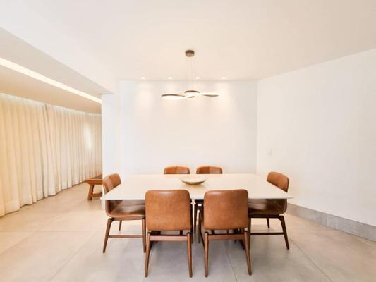 Sala para 3 ambientes, piso tábua corrida, teto rebaixado com iluminação indireta e vista panorâmica para cidade.
