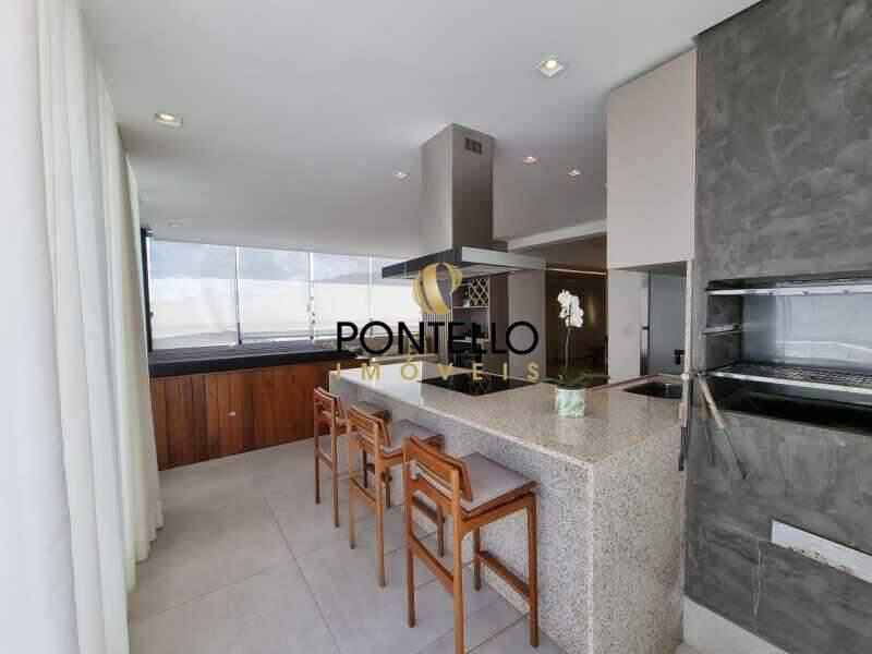 Área gourmet com piso em porcelanato, bancadas em granito, armários planejados, hidromassagem com deck de madeira e área livre de aproximadamente 70 m².