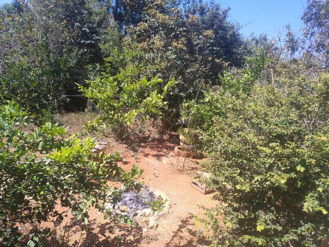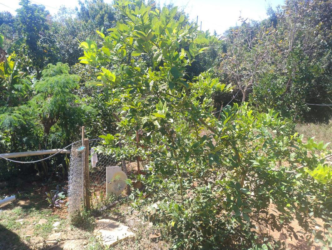 O terreno amplo conta com uma área verde exuberante, quintal e um pomar.