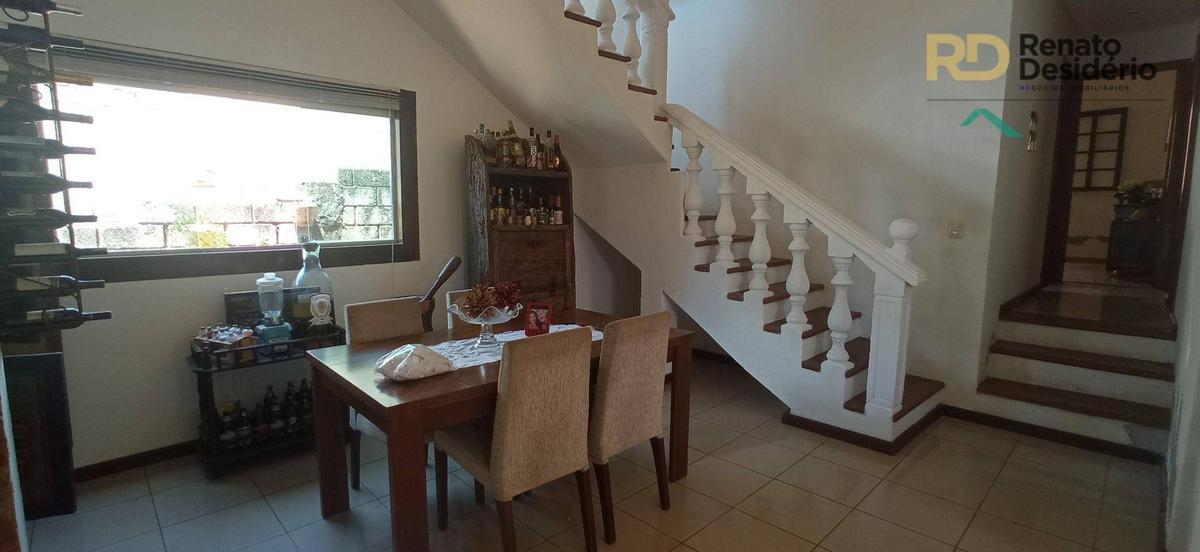 Sala de jantar, e cozinha com fogão em ilha, escada que leva para o terceiro nível.
