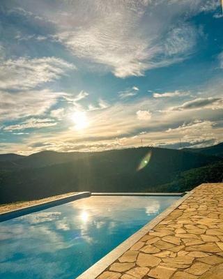 Área externa, piscina com borda infinita, pomar diversificado, duas duchas, vagas para aproximadamente 20 carros.