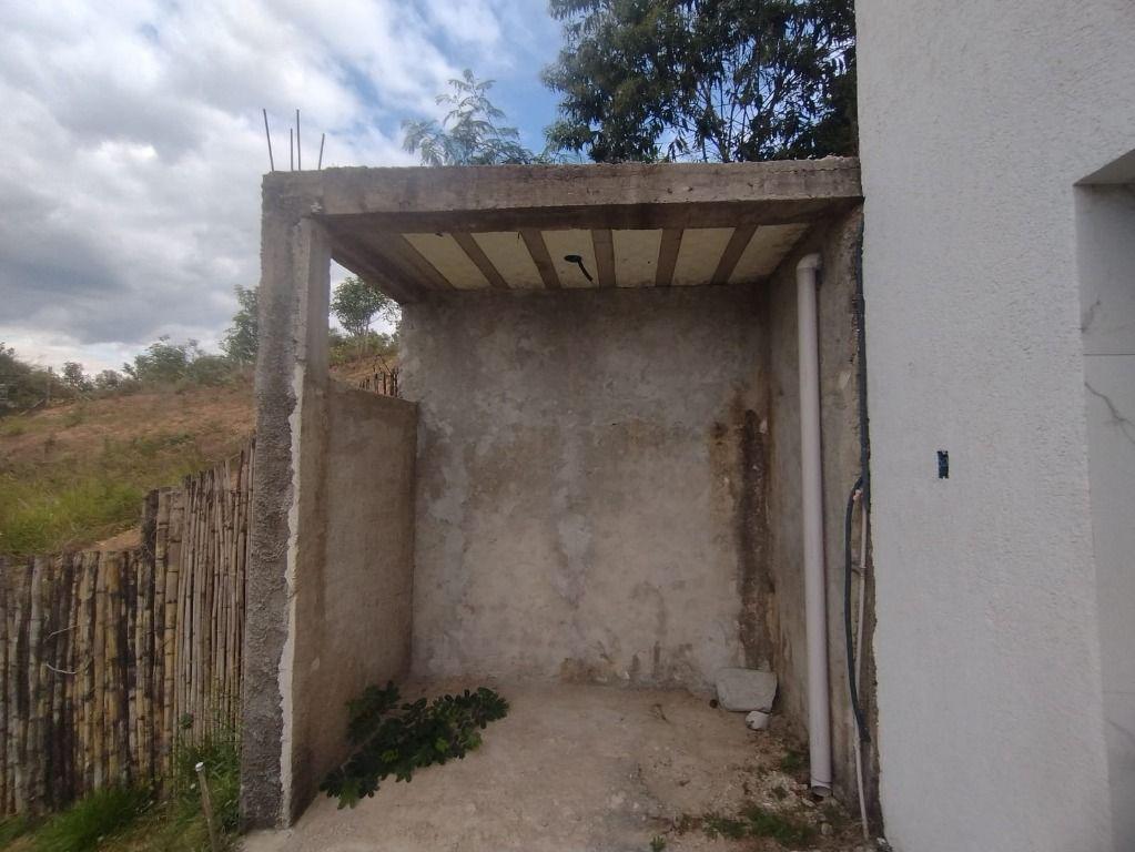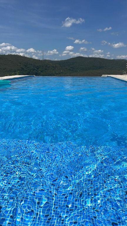 Área externa, piscina com borda infinita, pomar diversificado, duas duchas, sauna inacabada, estacionamento para aproximadamente 20 carros.