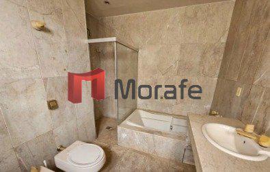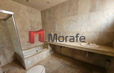1 banheiro amplo com piso em cerâmica com detalhes em mármore.