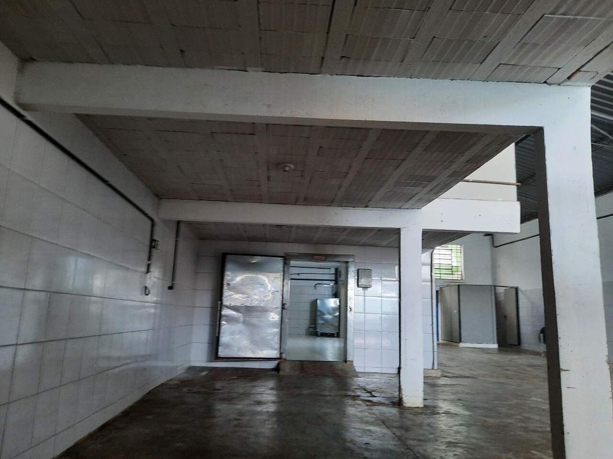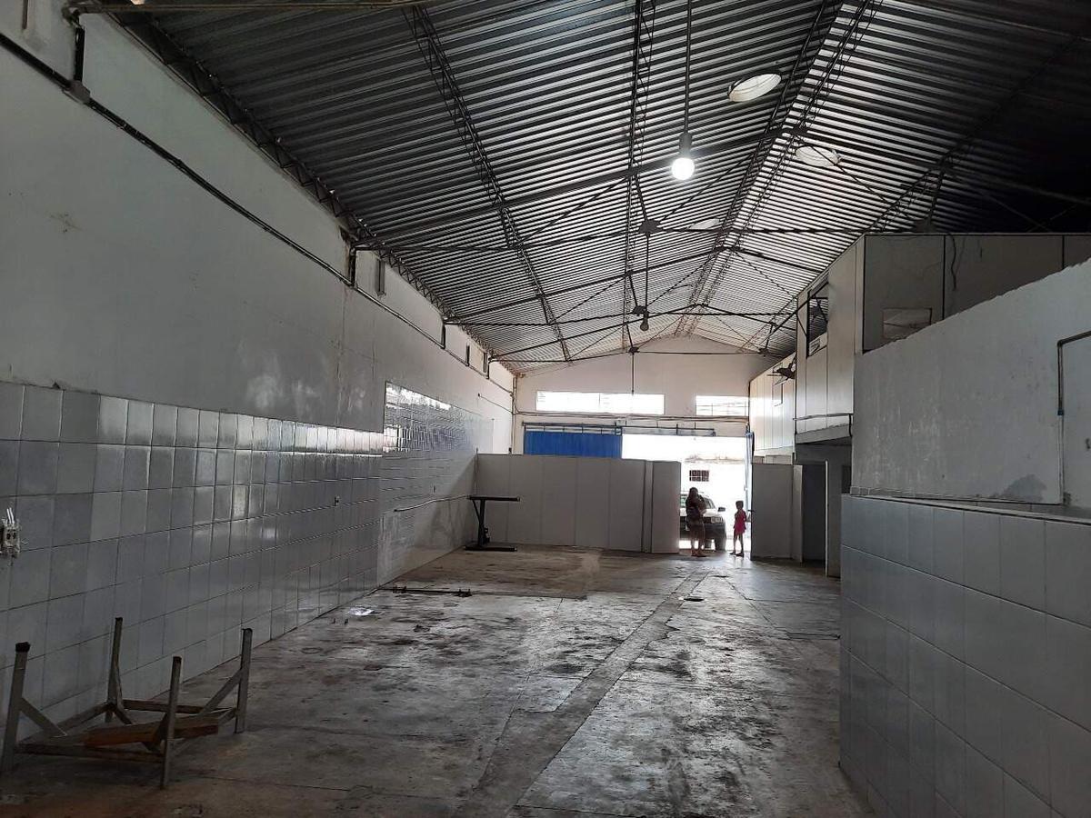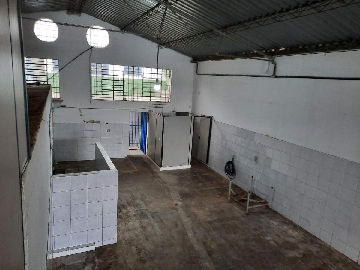 - Galpão com piso industrial, meia parede revestida em cerâmica e janelas protegidas com telas.