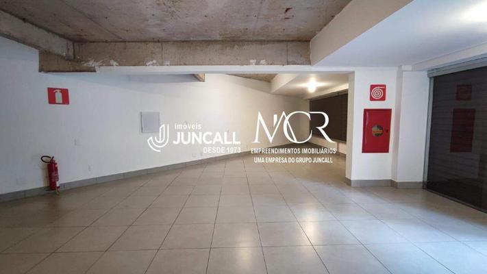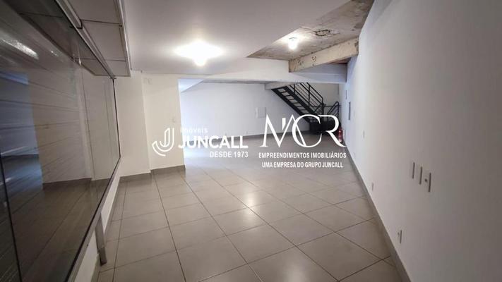 Loja com piso em porcelanato, frente com porta de aço e vidro, cozinha com bancada em granito.