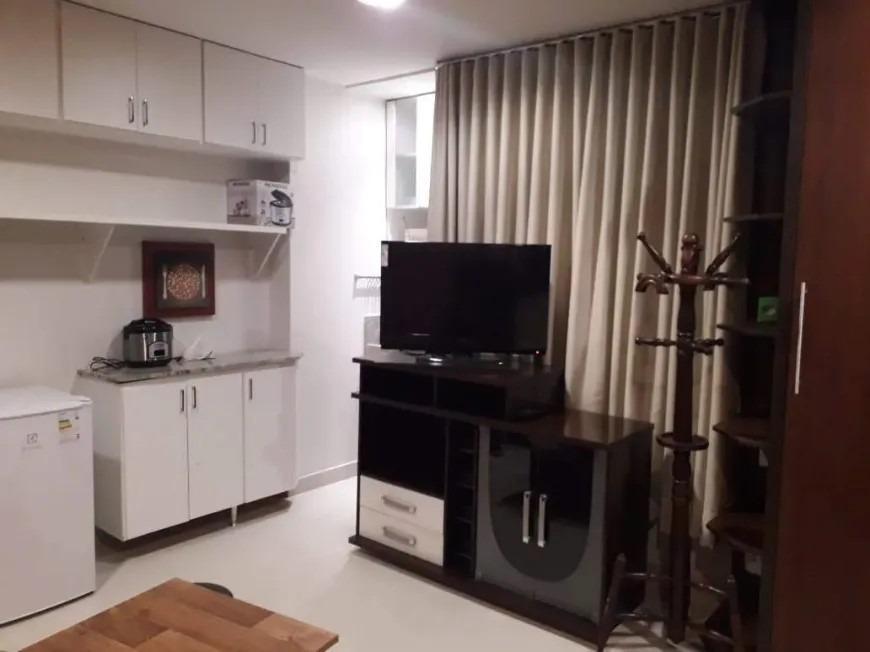 1 sala bem ventilada com piso em porcelanato, possui armários, frigobar, TV, micro-ondas, sofá e luminária.