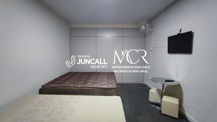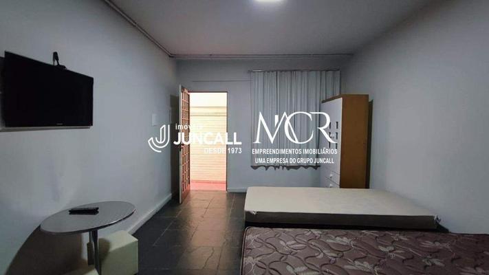 1 quarto mobiliado com cama de casal, TV, ventilador, guarda-roupa e mesa.