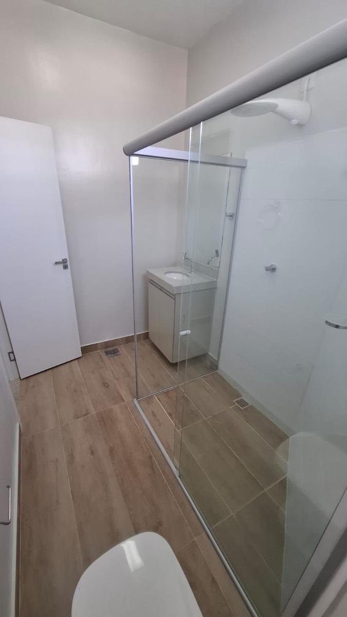 Toda em porcelanato, cozinha estilo americana, bancada em granito e armário, banheiro em porcelanato,, bancada em granito, armário , box em vidro temperado e chuveiro.