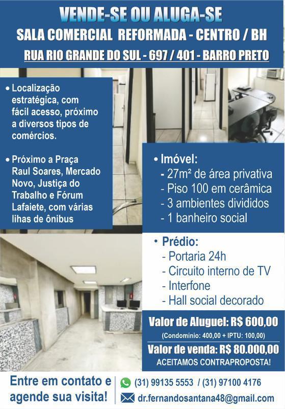 Vende-se ou Aluga-se Sala comercial Reformada - Centro / BHRua Rio Grande do Sul, 697/401 - Barro Preto.¿Imóvel 27m² de área Privativa.¿3 ambientes divididos.¿1 banheiro social.¿Portaria 24h.Valor de aluguel: R$600,00+ condomínio.Valor de venda: R$80.000,00 Aceitamos contraproposta.WhatsApp: (31)99135-5553 / 97100-4176 / 973144826E-mail: dr.fernandosantana48@gmail.com