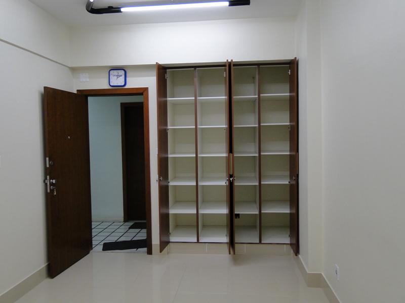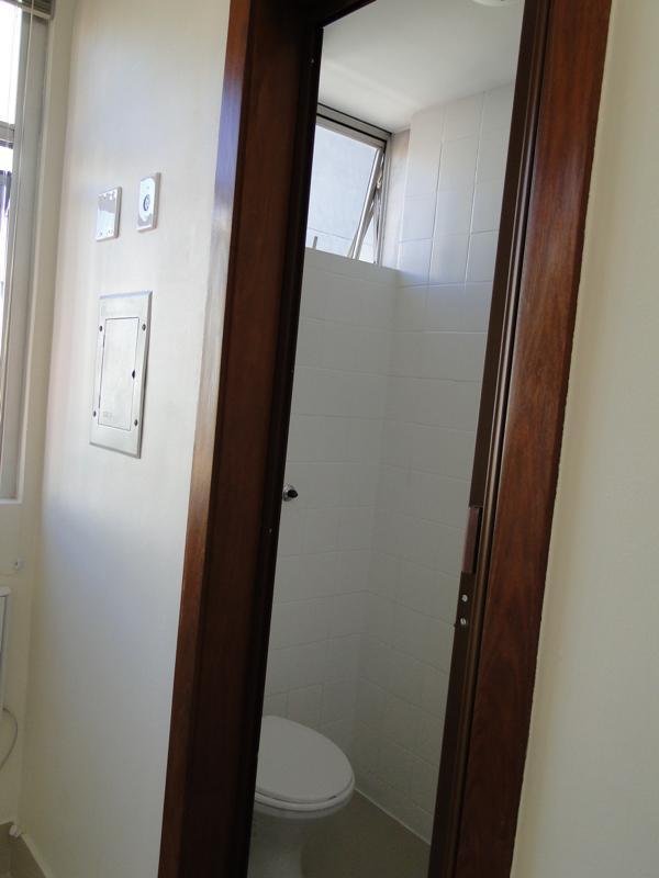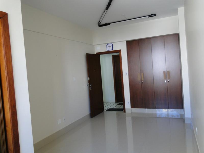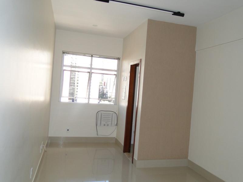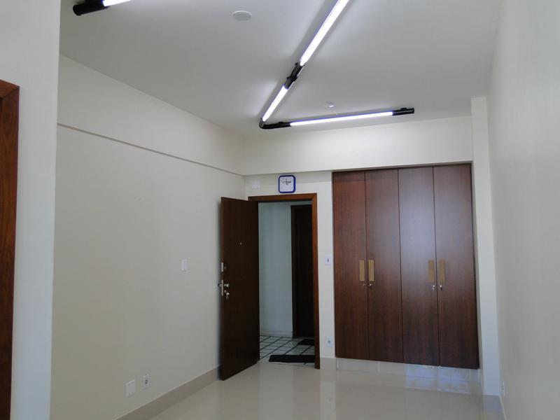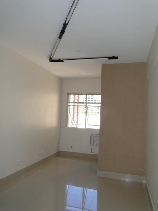 Sala com aproximadamente 27 M², piso em porcelanato, ar condicionado, armário embutido, banheiro e vaga de garagem coberta e livre.