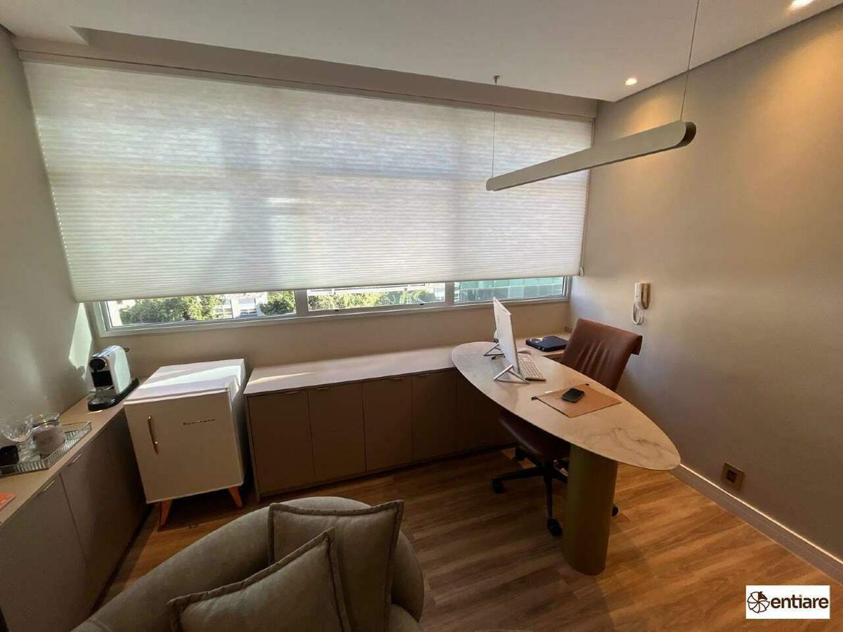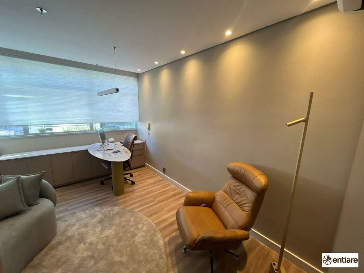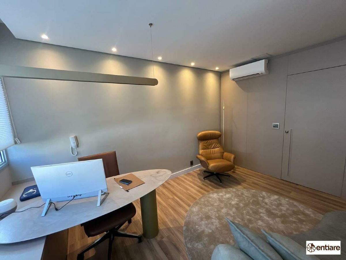 A sala possui 25m², piso laminado, ar-condicionado, interfone, iluminação integrada ao teto e cabeamento estruturado.
