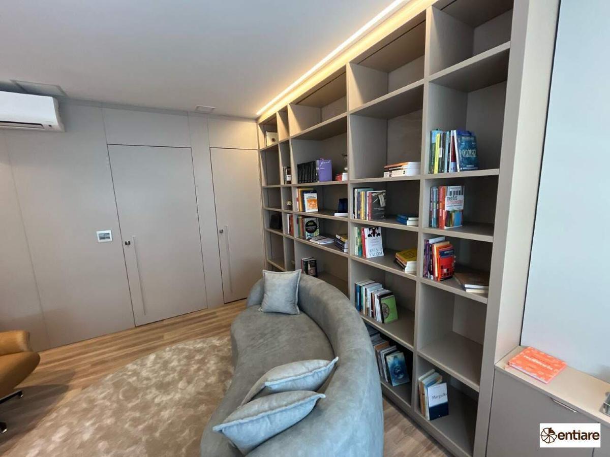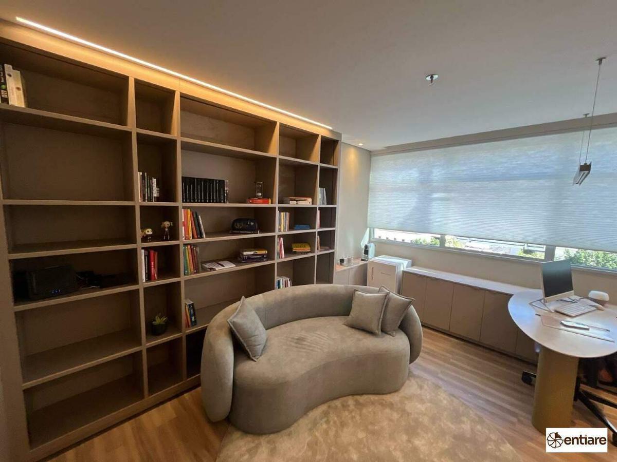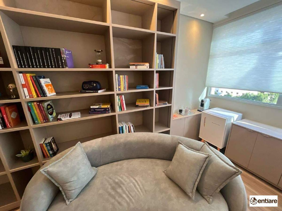 A sala possui 25m², piso laminado, ar-condicionado, interfone, iluminação integrada ao teto e cabeamento estruturado.