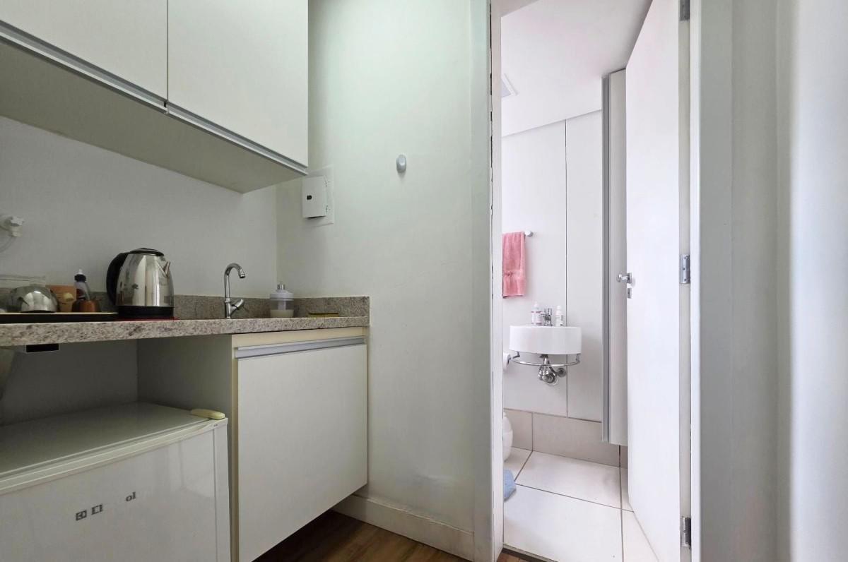 O imóvel possui uma área interna de 34,00 m², com sala de espera, copa e banheiro com chuveiro. Sem vaga de garagem, porém, o edifício possui estacionamento.