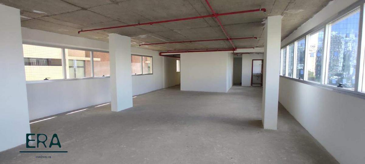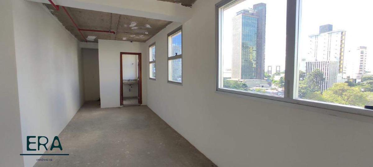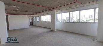 Excelente sala (meio andar) com 120m² de área interna, 2 banheiros, sendo um deles com acessibilidade, janelas acústicas e linda vista definitiva.