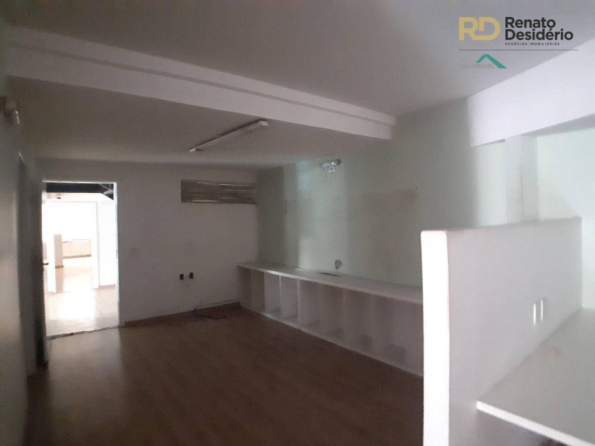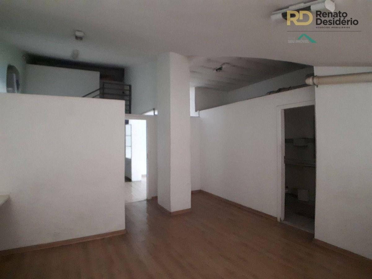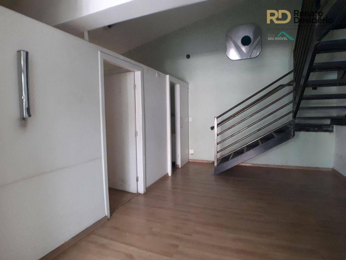 Mezanino com escada em L. Possui 2 salas grandes com 2 banheiros e cozinha com aproximadamente 73 metros quadrados