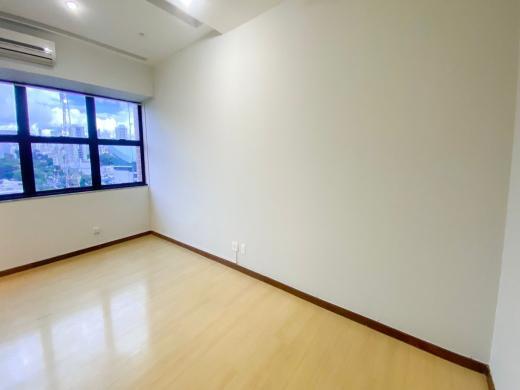 Sala de 22,05m2, de fundos, com piso em laminado, teto rebaixado com ventilador, AR-CONDICIONADO SPLIT e janelao em blindex. 01 banho social.