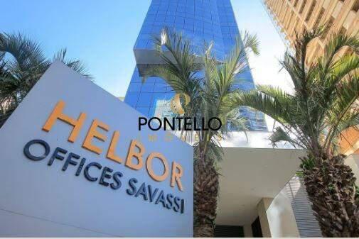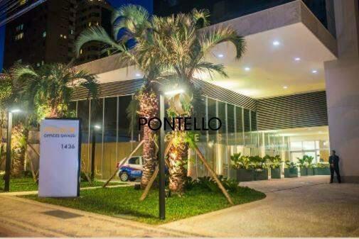 Sala comercial de 45,03m² com lavabo, área para copa e 1 vaga de garagem coberta sob pilotis.