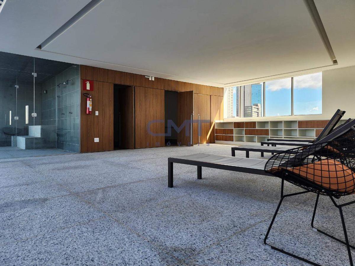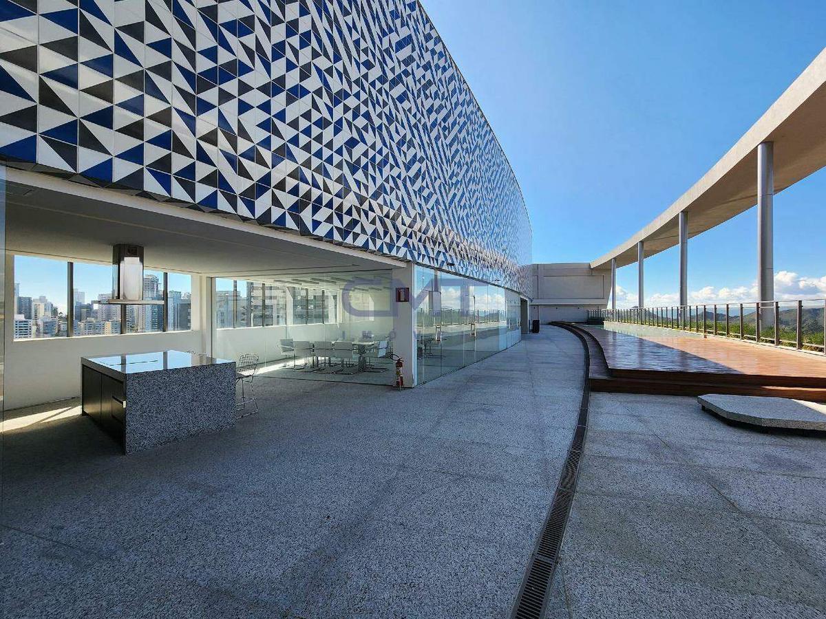 Edifício conta com elevadores panorâmicos e rooftop com piscina, área gourmet, academia, sauna e diversas salas de reunião.